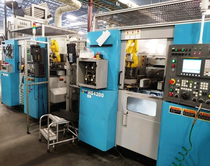 2013 Kitako HS-4200 with Fanuc OiTD CNC Control and Fanuc Dual Robot Integrated Installed Robotic Part Loaders and All Input-Output Conveyors Systems and Flexible Post Process Gauging Systems and all Ordered New Options Installed.<br><br>Main Specifications<br>Model HS-4200<br>Max. Turning Diameter and Length 7.8" x 4" <br>Chuck Size CNC Collets or 8" x 4 Units Installed<br>Spindle Nose A2-6<br>Spindle Motor 15HP / 20HP<br>Maximum Spindle Speed 4,500 rpm <br>Carrier Index 1.5 seconds / 180<br>X-Axis Travel 6.3"<br>Z-Axis Travel 9.8"<br>Rapid Traverse 945 IPM (X), 1181 IPM (Z)<br>Turret Gang Type Slide for Mutiple Tools & Cap. Live Tooling on Gang Slide<br>Turret Index 0.3 second per Station<br>2 Fanuc Robot Loader for Carrier Loading System<br>Maximum Part Size (diameter x length) 5.9" x 3.9" <br>Maximum Part Weight 6.6 lbs x 2<br>Feed Rates (X/Y/Z) 6,693 IPM / 4,724 IPM / 2,165 IPM<br>Totally Enclosed Splash Guards<br>Door Interlock<br>Hydraulic Circuit Alarm Indicator<br>Production Counter<br>Maintenance Counter<br>Tool Counter<br>Coolant Equipment<br>Rear Discharge Chip Conveyer<br>Foot Switch<br>Alarm Message Function<br>Lubrication Circuit Alarm Indicator<br>Servo Motor Driven Carrier (2 Second Index Time)<br>Tool Holder for 8 Station Drum<br><br>Special Design Features <br><br>Load While Machining Four spindles, generally partnered in pairs, are mounted in a square pattern in a large cylindrical carrier drum.<br>When the carrier is indexed 180 degrees, two spindles/parts move from the loading zone to the machining zone. At the same time, the other two spindles/parts move from the machining zone to the loading zone. As two parts are being machined, two new parts are being loaded. This continuous indexing is similar to that of a pallet changer on a machining center.<br><br>*Unique Four-Spindle, Four-Axes Flexibility<br> The spindles, slides, and turrets work independently and simultaneously for “operation matching” flexibility: AA/AA, AB/AB, AA/BB, A/B/C/D.<br><br>*Dependable, Close Tolerance Performance<br><br>Spindle rigidity and positioning are ensured by the use of a large diameter, precision-toothed curvic coupling.<br>The solid headstock, bed, and box shaped ways, over-sized ball-screws and servo motors, and robust turrets are all designed to perform heavy cutting with impressive chip removal rates.<br><br>Ease of Loading Since the spindles in the loading zone are outside of the machine, there is unrestricted access, allowing for easy manual, robotic, or gantry loading.<br><br>*Small Floor Space Requirements<br> <br>Kitako HS-4200 Factory Demo Operation Full View!<br><br>https://youtu.be/3WakZBQTpjs<br> <br>(3) Installed Kitako HS-4200 Operation Full View <br><br>Videos Links http://tbf.me/a/6ldLu<br> <br>Special Price:$Please Email or Call Neg. (1-2) Machines!. <br><br>Machine is Fully Installed for Inspection and Immediate Release on Orders!<br><br>F.O.B: Machine Pricing on factory prep for shipment and Machine Loading on Request.<br><br>Terms: Payment in Full Prior to Shipment.<br> <br>I thank you for your review and consideration and look forward to further questions.<br><br>Sincerely,<br>Mark V. Murphy<br>Murphy Machinery Sales, Inc.<br><br>