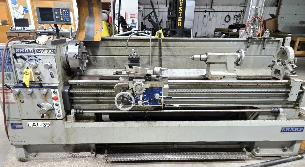 SHARP 1880C ENGINE LATHE UNDER POWER IN SHOP DOWNSIZING PROJECT