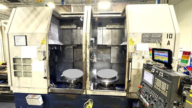 2015 Takang TKV-860-HT CNC Twin Spindle Vertical Turning Center in Very Good Condition with 2- 31.5" 3-Jaw Chucks, 2-Rear Discharge Chip Conveyors, 2-Auto Doors with 2 Speed 50 Hp. ZF Gearbox Fanuc OiTD CNC Control * Only 5,505 Cutting Hours!. Full Videos in Process.!